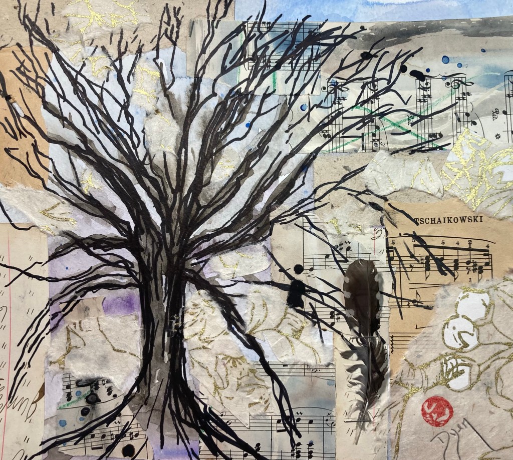 Bare limbs, a woodpecker calls