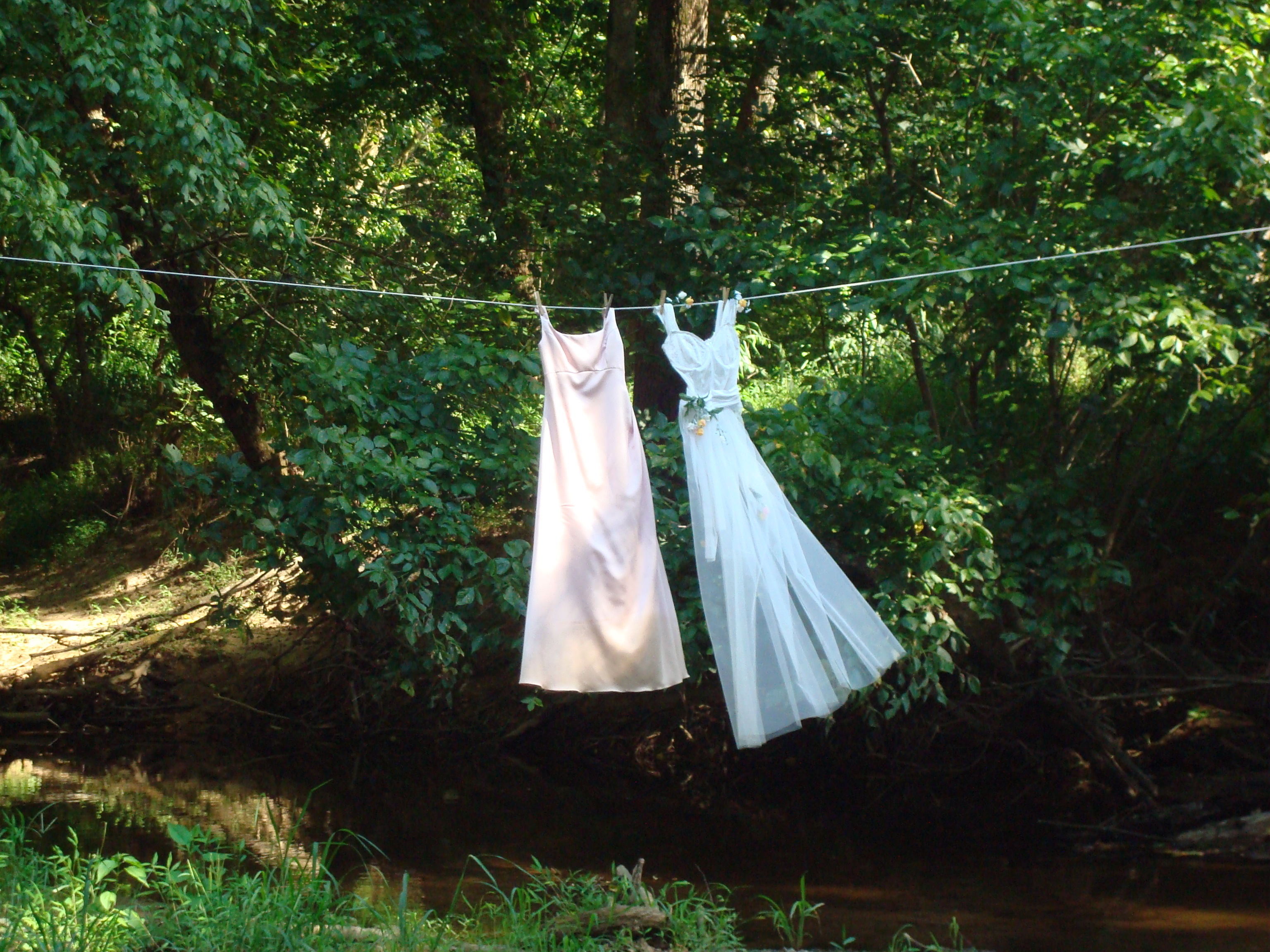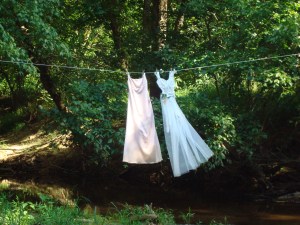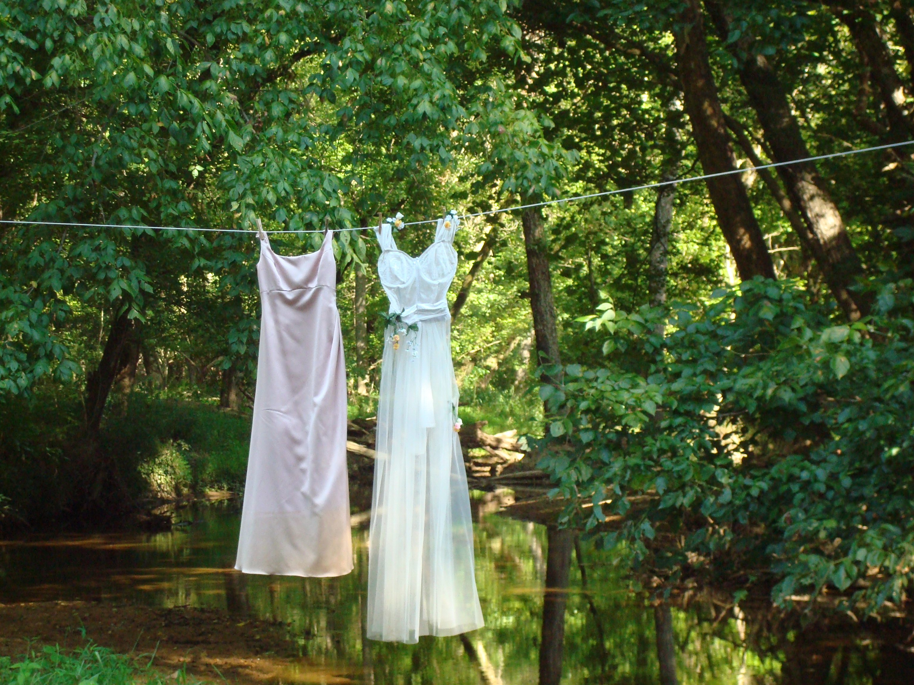 So, you can imagine my surprise when crossing the creek we saw what we guessed to be a wedding dress and bridesmaid dress hanging with clothespins on a line across the water. What a hauntingly beautiful site. The dresses reflected the light of the sun and the sparkle of the water, swaying in the breeze, light and airy.
