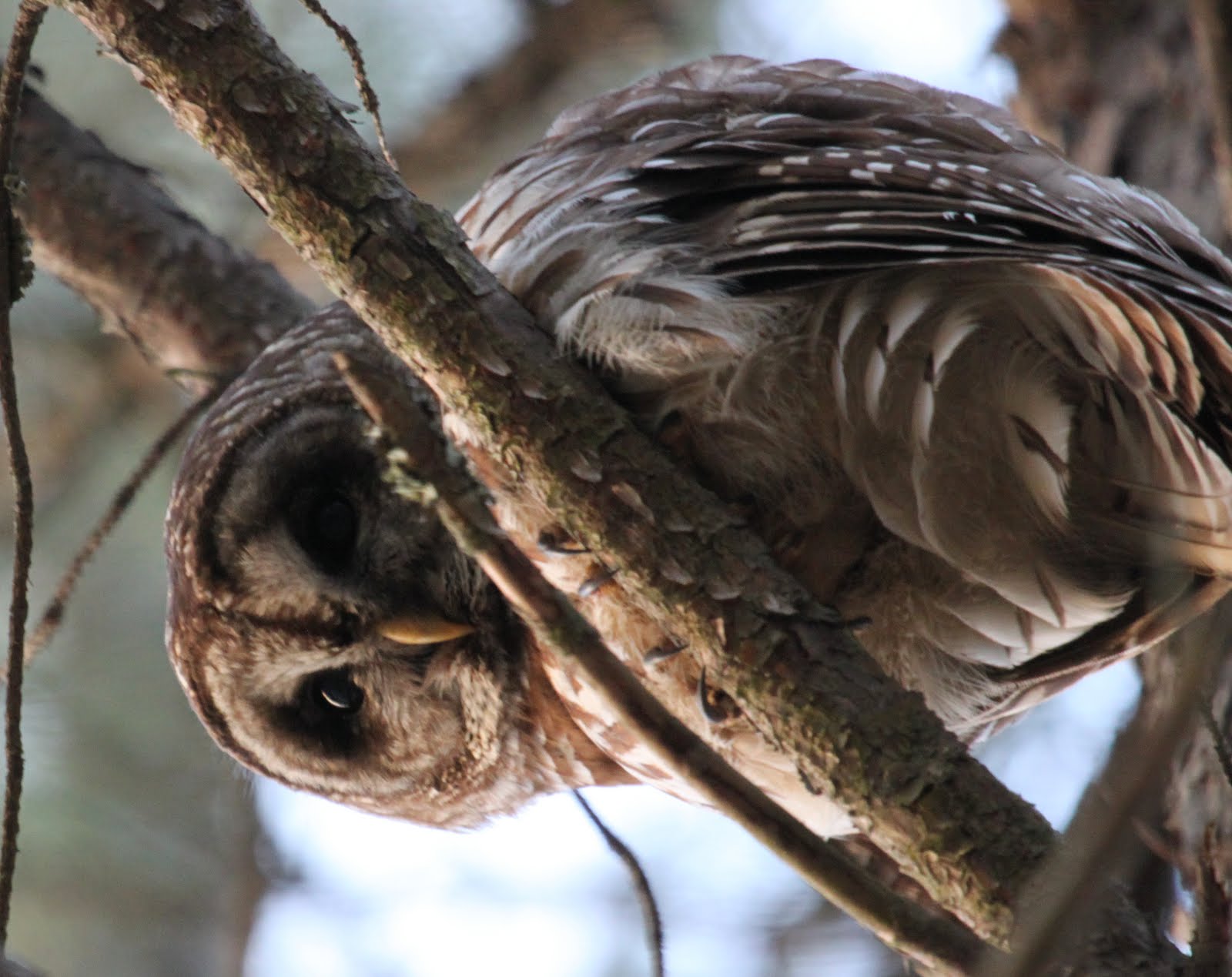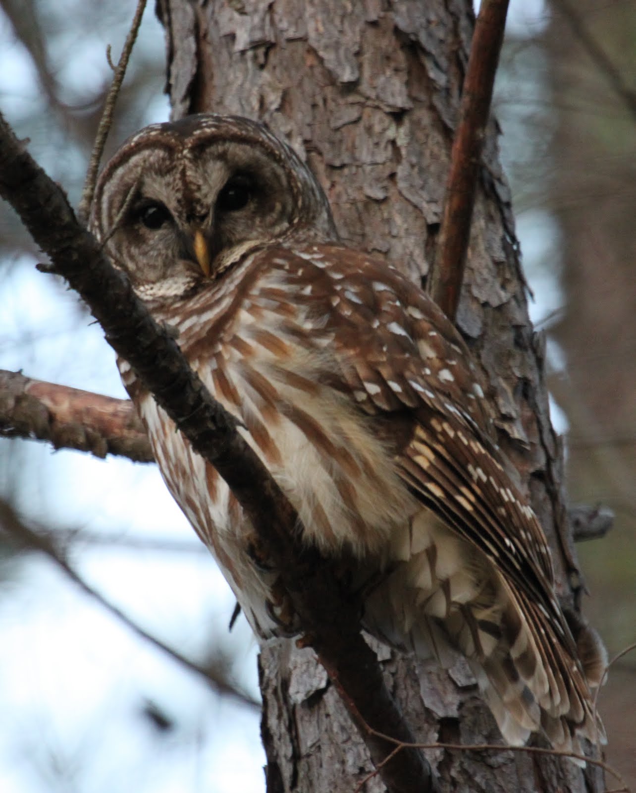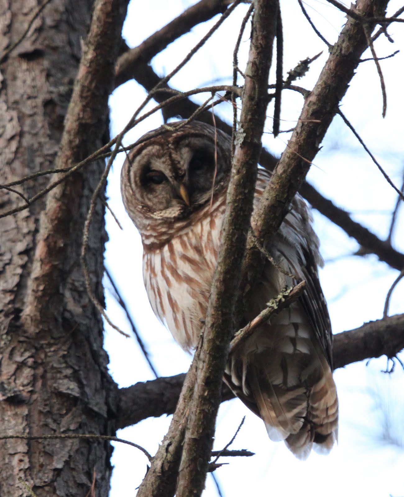 Sneaking up to get a closer view I was thrilled to find a beautiful barred owl perched in a pine. She seemed unafraid of my presence while staring right at me. I quickly called my neighbor Jane Schroeder, a fantastic photographer, to jump in her car and come.