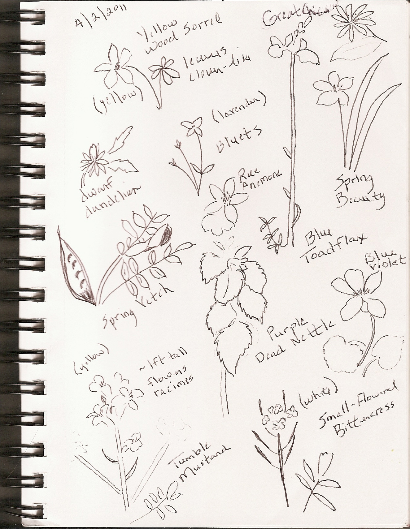 Wildflower guide in hand, Sam searched the keys while I made sketches. Not as easy as it seems actually. The need to know regular from irregular flowers, whether the leaves are opposite, alternate, toothed, lobed, etc. , and if the flowers grow in an umbel, panicle, raceme, or spike helps one to navigate the guide. Obviously two folks that are out on their knees in the woods have a great desire to get the name of the flower right.
