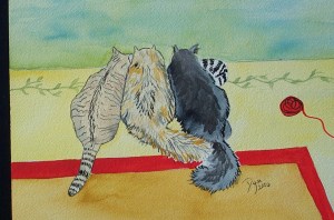 Art Prescription: Sam and my brother Joel laid a new bamboo floor in our bonus room today. It looks fabulous!! And how wonderful to hear Sam and Joel working together and laughing and talking. Not sure what the record was today, 105 degrees, but we are setting some records here in NC. My newest paintings are waiting for my return… Cats are very curious about their new floor.