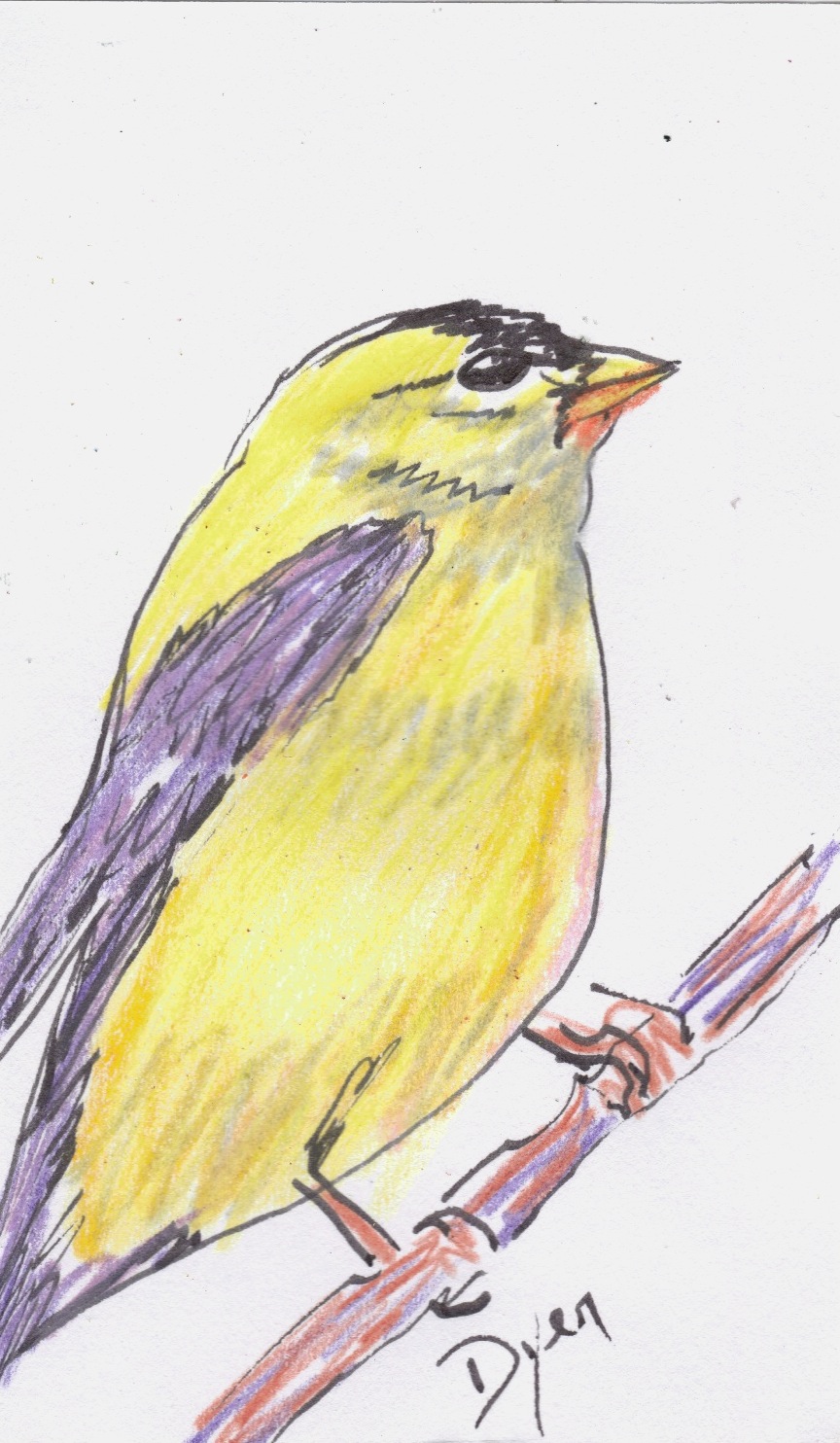 Goldfinch August 11, 2014 August 11, 2014 / beverlydyer Canary yellow High-pitch, Gold Finches seek treats August seed harvest. Art Prescription: These bright yellow birds can be seen coming after my coneflower gone to seed. Pen and ink sketch with colored pencil 3 x 5 index card. Like Loading...