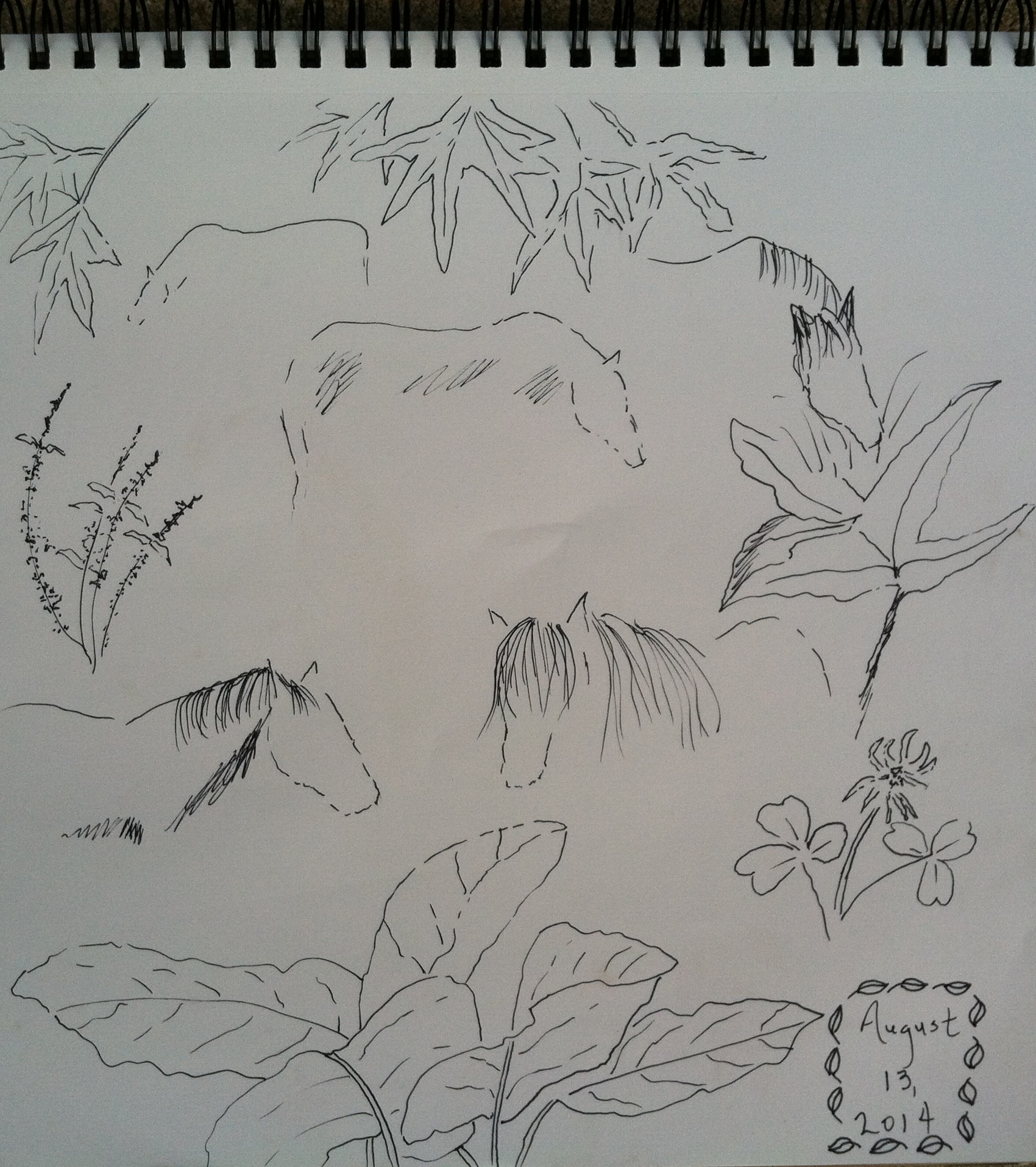 Art Prescription: After a busy week and I have to mention the loss of a great actor, Robin Williams, I needed more than ever to go out to Blue Skies at Mapleview to be at one with nature. Horses, with their all knowing eyes, greet you where you are. My friend Ginger and I sat under the shade of a tree and talked about life and living and horses. It was a great day. Sketchbook –