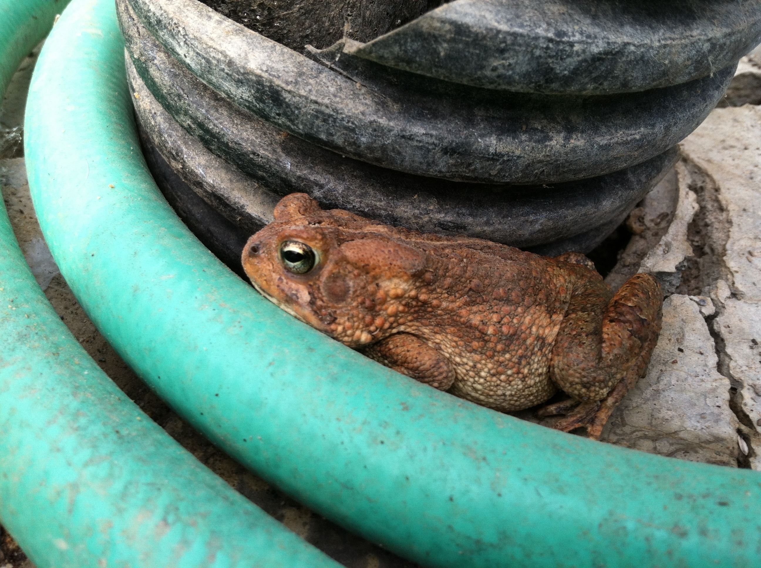 Art prescription: As I went about feeding the horses this morning, I found other creatures sharing the land. A spider who lives on the fencing, lots of birds, and grasshoppers, a couple of deer crackling through the woods. And this little hose-house resident.