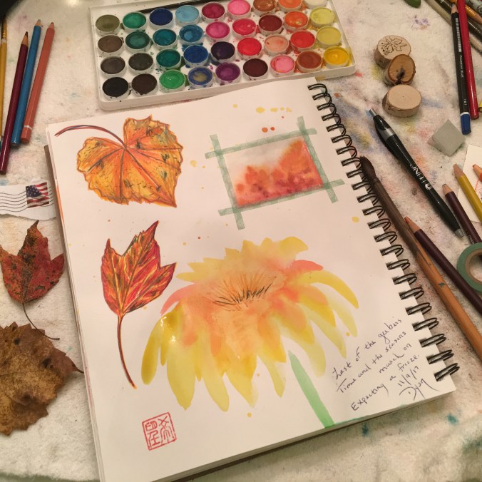 Art Prescription: Some of my loyal readers have asked me to talk more about my process. So, this journal page is made up from several small works, see previous posts. I used washi tape to glue in my tiny watercolor and then free-handed the Gerber. It’s a sketchbook feel and a reflection of my day.