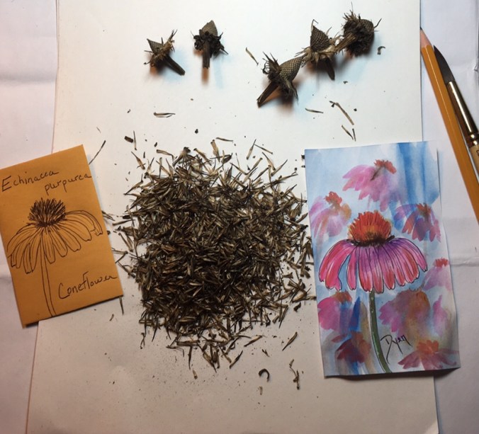 Index card with watercolor, echinacea seeds to share.