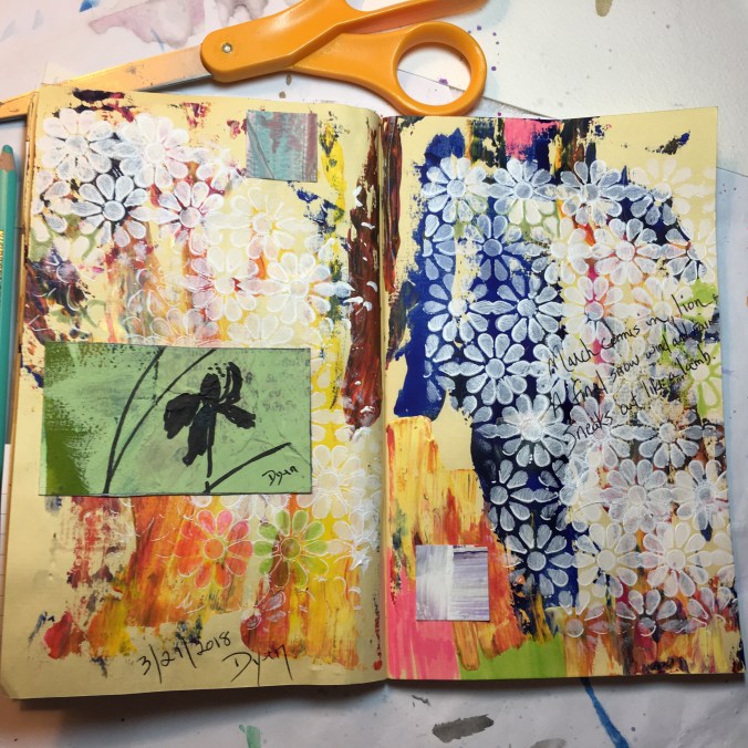 Art journal with acrylic spread, stencil, and collage.