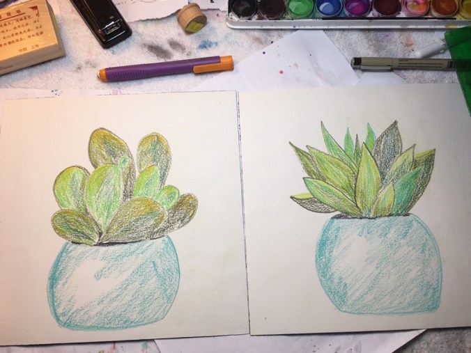 I set out to do a couple of cacti drawings with watercolor pencil. The first layer is just form. Trying to get the drawing accurate.