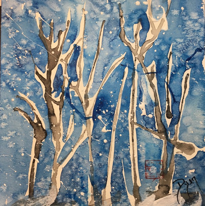 Here I have negative painted around the blown winter tress I did last week. Guess I’ll need to do another for spring. Just feeling winter!