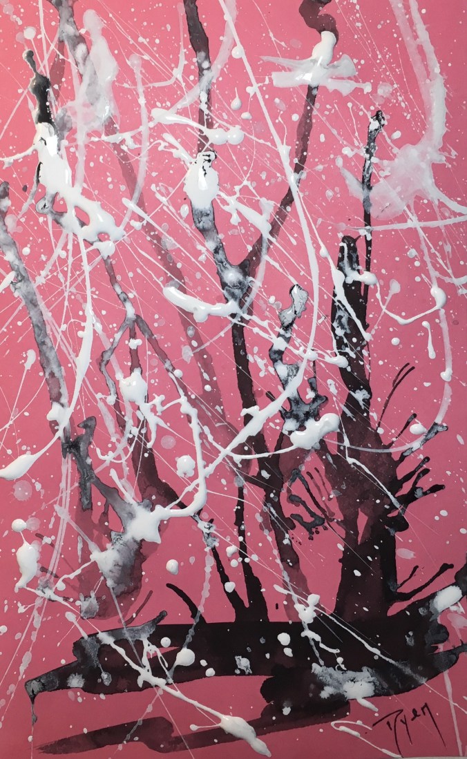 Art Prescription: Blown ink on a pink index card. Splattered with white acrylic.