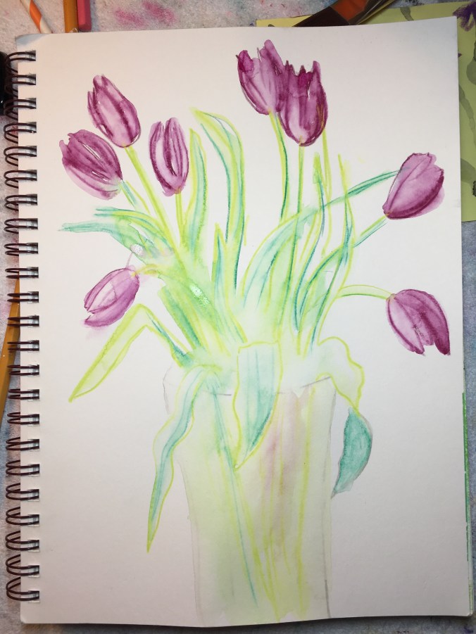 I started with tulips my husband bought me. I did a simple drawing using water-colored pencil.