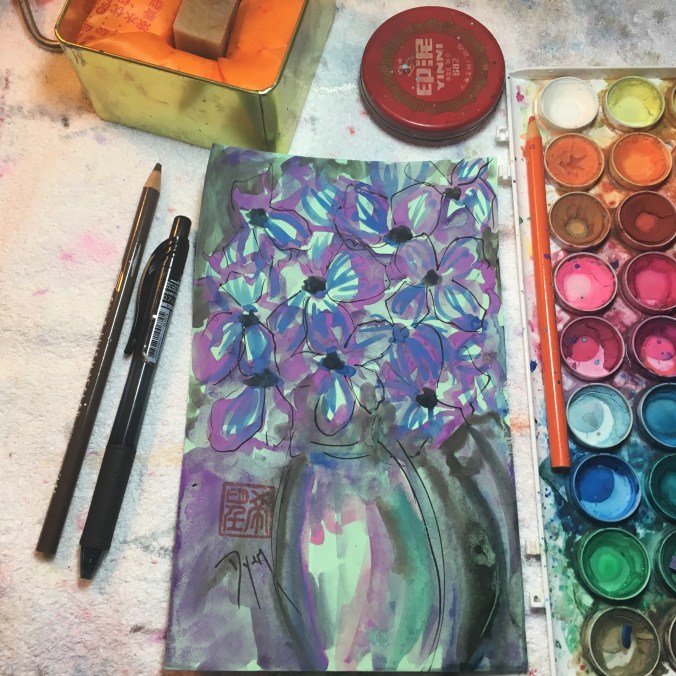 Watercolor sketch on a green index card: