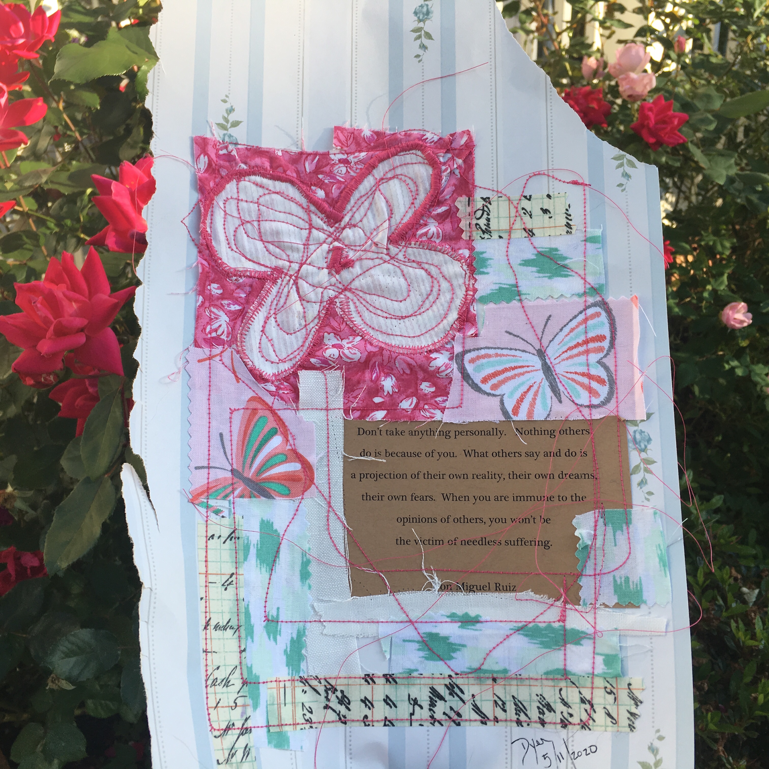 Fabric collage with quote and improv stitching: