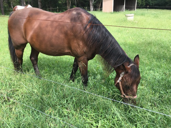 My horse Finn thinks he has landed in grass paradise as he is moved to safer grounds.