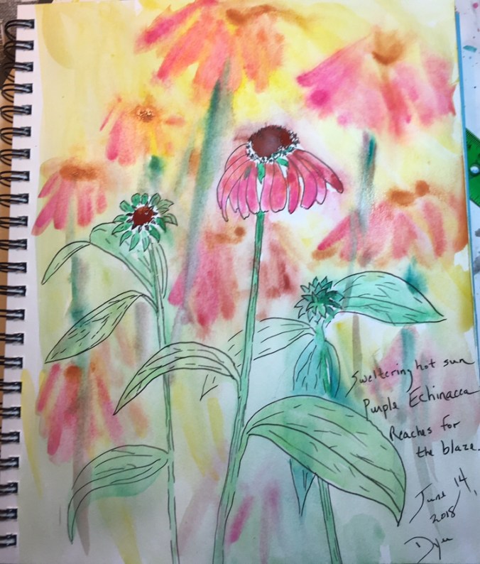 Art Prescription: I love my evening garden time, checking out what’s blooming. Purple Echinacea and gardenias are the current stars. Bee-balm which invites hummingbirds is about to burst.