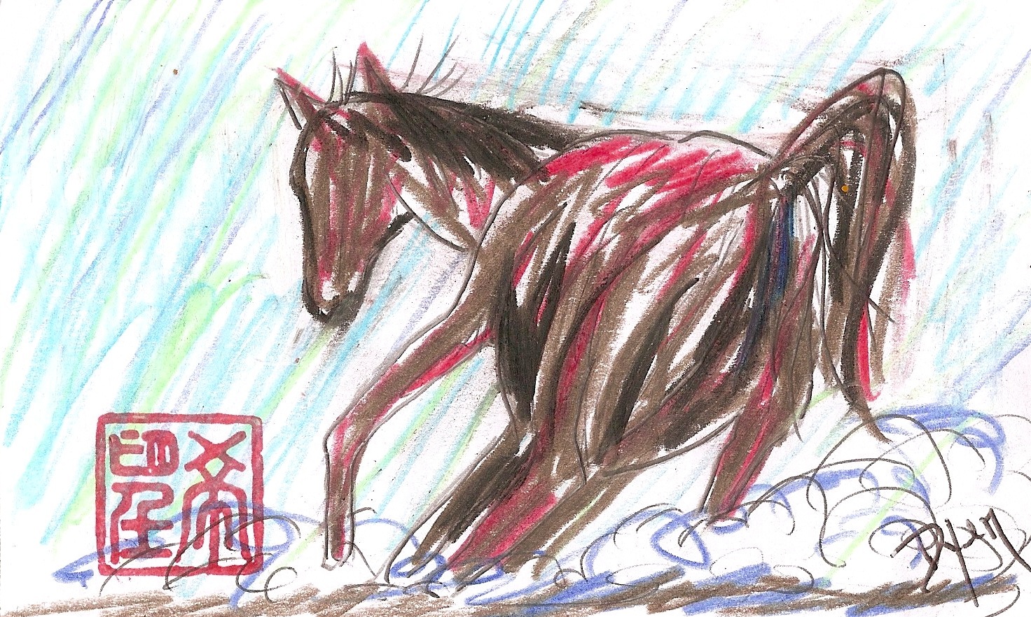Index card with pen and ink and colored pencil: