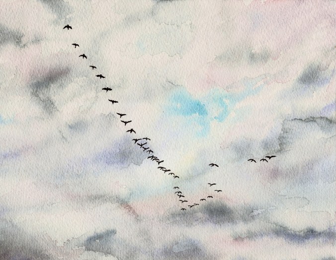 Art Prescription: Researchers have long been fascinated by the flocking behavior of birds and fish. How in one sudden flash they all turn and move in unison. One theory is that of “collective thinking.” Or that there is some electromagnetic principal going on. Either way it’s a beautiful sight. Sit back and watch birds flying south for the winter. They turn and land in the trees as a group, creating interesting sound effects in the forest. What if all of mankind were to work together like this?