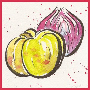 Art Prescription: I find myself as of late anxiously wondering about the future. Checking my email frequently for that one company I’d love to license with. In the mean time busy submitting new art for 2013 product. Art licensing requires you to live a bit in the future…future trends…future possibilities. My evening walk was side-tracked by a thunder-storm. So I set about to bake a quiche. What’s in the fridge? Asparagus. Nice. Reminding myself to live in the moment I layer shallots, asparagus, and freshly cut basil from my garden with mozzarella cheese. This aroma now fills my house.