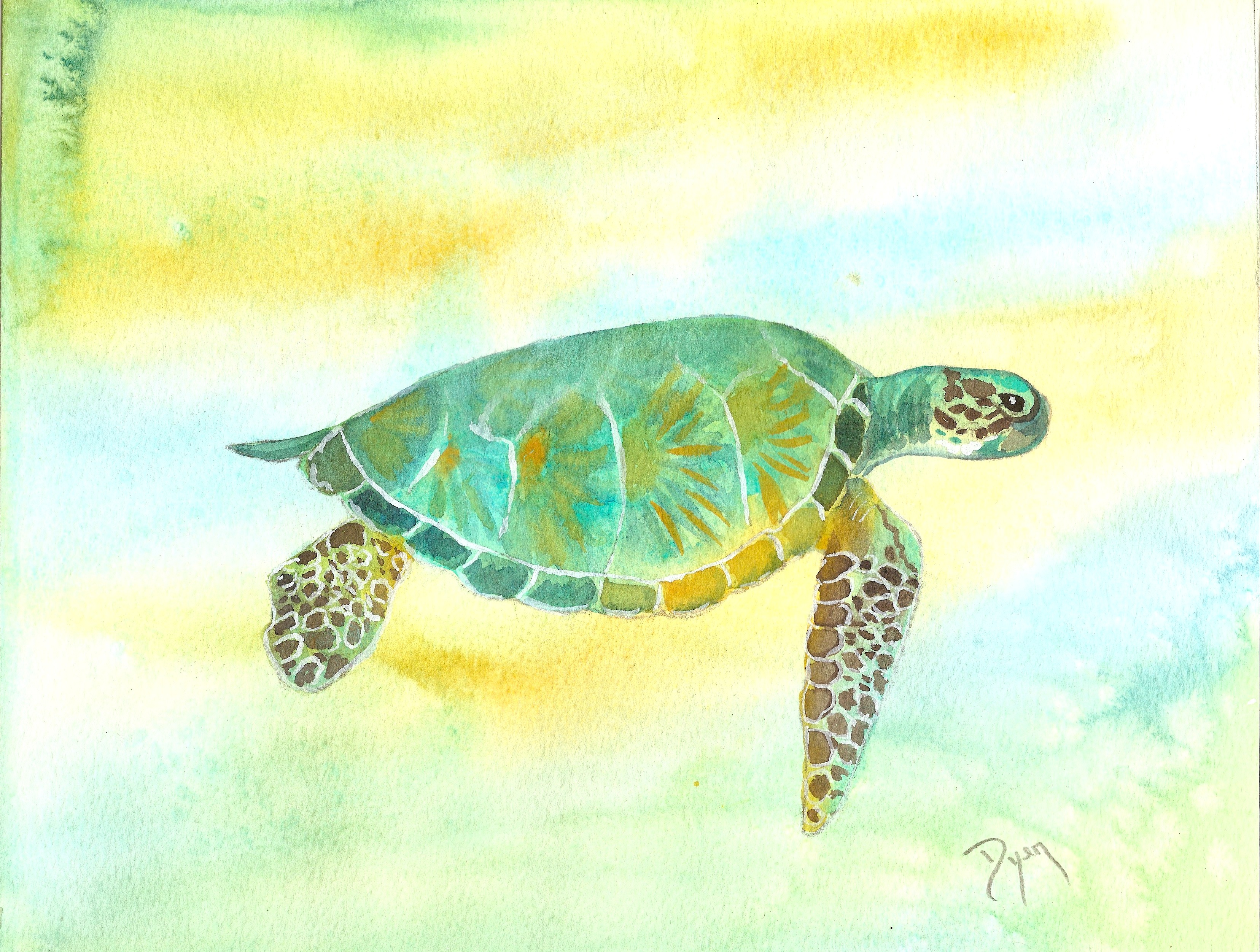 This is my second sea turtle. The first one I did with alcohol inks which was fun and bright and bold. This one is softer, done with watercolor. 8 1/2 x 11 watercolor