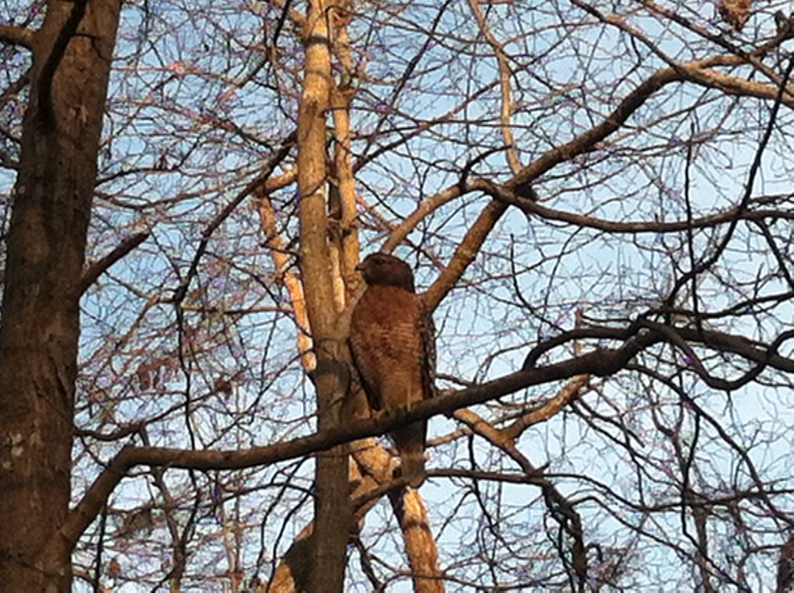 Art Prescription: Today’s haiku is momentarily interrupted for a near hawk encounter. I was writing about Mourning Doves…when through my binoculars I caught a glimpse of something in the trees. I searched, but no find. Turned to walk and right there!!! over my left shoulder sat a big hawk. He/she looked at me and I startled…I mean really jumped it was that close! Then I just got quiet and watched. I wondered why this winged beauty was braving my presence. The hawk took off then to join a mate…