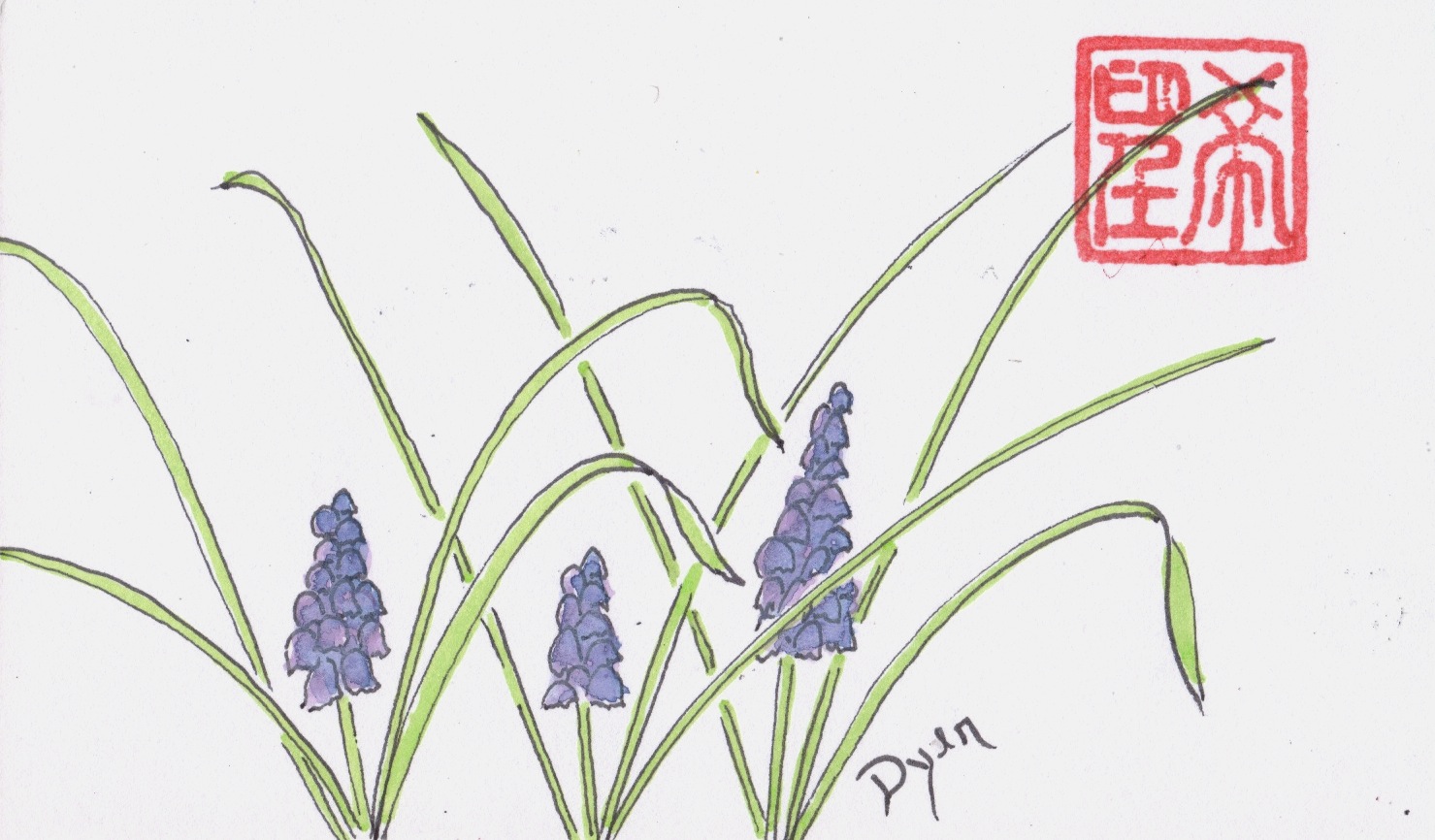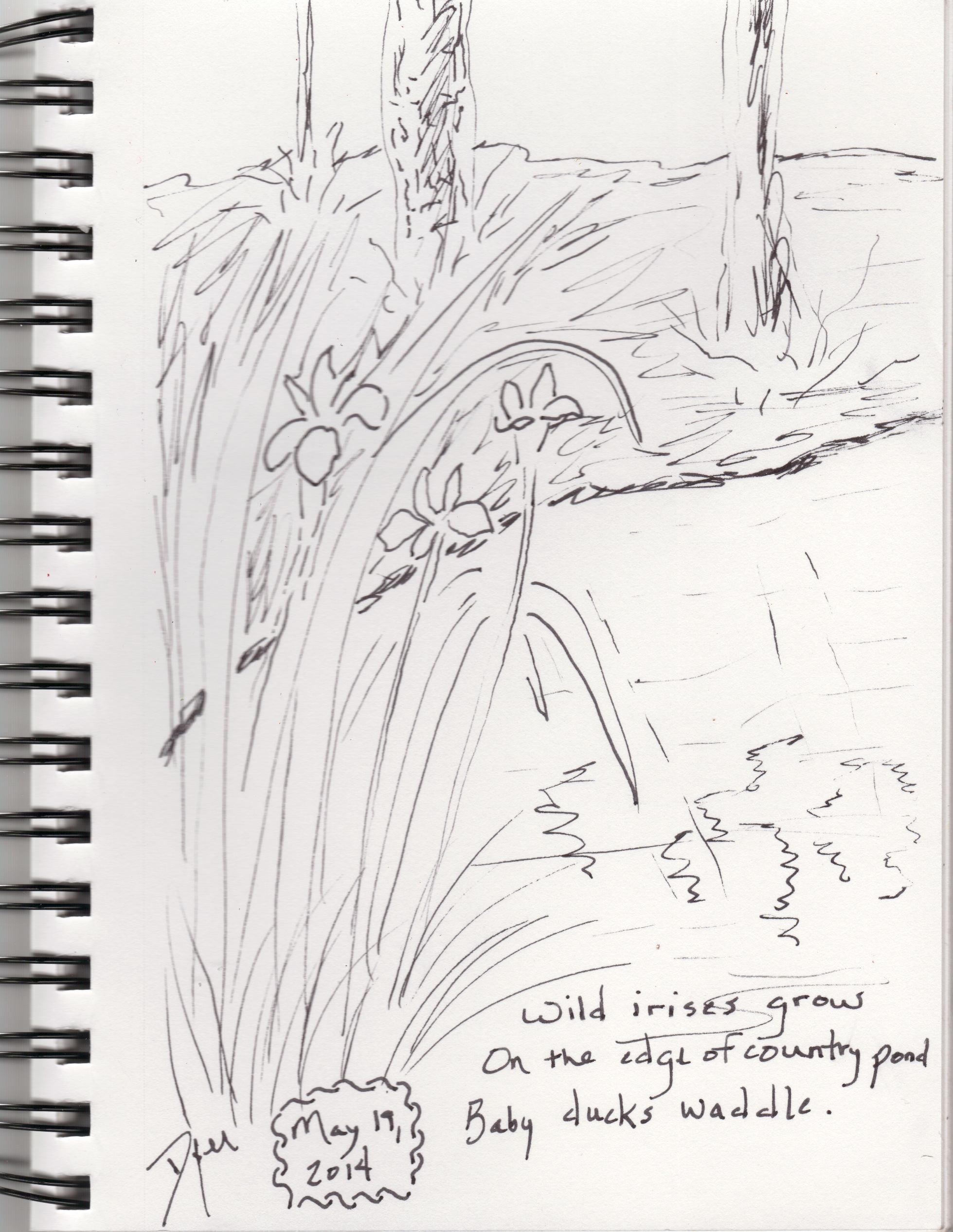 Art Prescription: An evening walk around our neighborhood pond…relaxing. And I see a duck with 10 ducklings trailing behind her. I hope to get some sketches of this fowl family. For now, the purple wild irises hold my attention. Pen and ink in sketchbook.