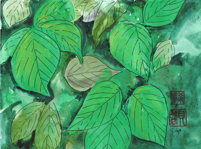 Art Prescription:  Kudzu is an invasive vine that grows over entire patches of trees making shapes for the imagination. A lover of shades of green, I find its heart-shaped leaves attractive, and grape- soda scented flowers must lure many insects. But Kudzu can take over in an unwanted fashion.  We have a local farm here in North Carolina called “Cudzu Farm.” http://www.cud-zu.com/index.htm