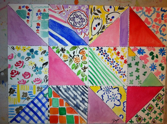 Art Prescription:  We are so lucky to have about five quilts made by my ancestors. Both my mom’s mother and my dad’s parents quilted, and this is back in the day where it was all done by hand! I remember my grandmother’s living room being transformed into a quilting bee as the furniture was moved back, the  quilt racks went up, and she and my aunt would sit and sew for hours. Today I did a watercolor sketch of a section of quilt just for fun.  Look around your house to find inspiration!
