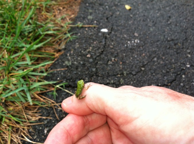 Art Prescription: I like walking in the rain, it’s peaceful. A long loop on an overcast, drizzly, Sunday suits me fine. Our neighborhood path winds it’s way along the street, and because this land was once wetland we have a few easement ponds and streams. We have geese and ducks and turtles, herons, hawks, cattails. Along our way this morning we found a couple of – just from the tadpole stage – frogs. They are so cute!! Reminds me that nature always has a surprise!