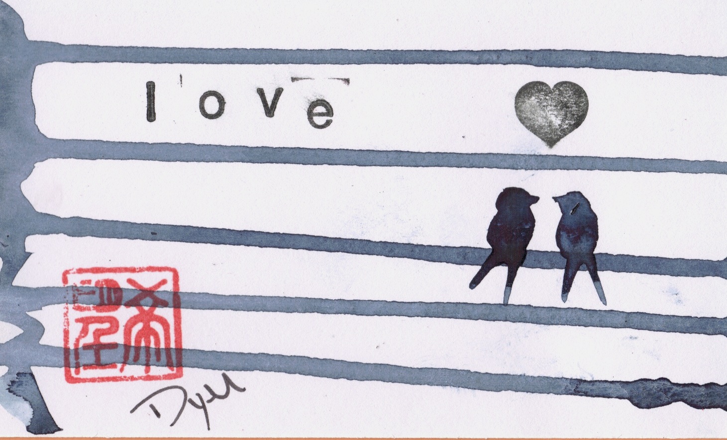 Art Prescription: Okay, so I might wake up to a sea of white, but right now…I don’t see any snow!!! Since early morning the forecast for a winter storm has been all over television, radio, and Facebook. I did go to the grocery store for stamps, and they were out! Schools cancelled today. Many businesses closed early. Curious. Warm in my studio where I painted love birds.